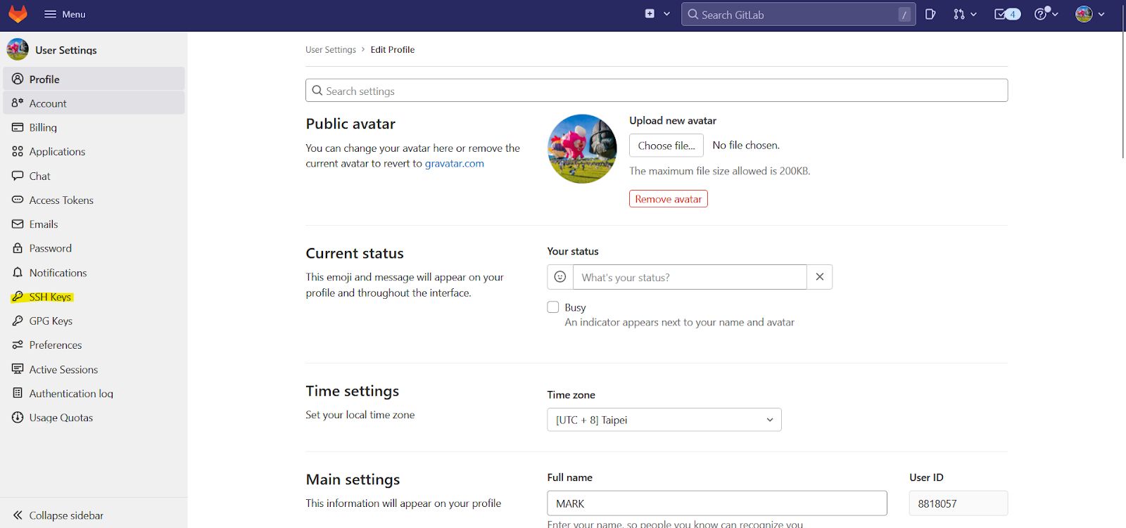 ssh-rsa AAAAB3NzaC1yc2EAAAADAQABAAABgQDviHPSGo7u47vDSboz3NMVGHTqan8LLdeq3gYncLao46CcT/7Bbk2vh197ujjk7azaqJo2U4tkxmiLRFhD7ughmyC6g42k5ylnJAn2UkxCpG7LpzNQbhJAoG20mas8VVxc8w2QhZJpvvV8bX51LoOvUxBv+o1vwmm/3B5n3VXKt8Iy1WjiKW8RlPToK0tSbv40CR4tWKVmBIchhJBb46LFCNGJKea1RMUytCaFOV30UDiqvgWpaqcYrfVrb6SPBcaR0kKmjVQt6oqH5aNUlpN7uAYb8yBzKX+Lahr7OeIzNUThtR2HGRGITV4WROLpNEzB3WDCdEI6QTCVGepfMbI3g+T9ksukQsheuP50DqIYBEaLdIqfnJrLKWrjvlPgsmU1F8TdBs2VXeg59g1RLsEu3tYE/tRizfACrbLlEdN2+WcRHiKR54MZII53bXSwXTTatqbbBDM/W0q54xN/H5IDkBTo9+V8jwo4ysvVjRJ8jOseIS6T5lo0WOFtD/hsfhc= your@email.comLogin to where your git repository is hosted (here we are using GitLab) using the account you want to use the ssh-key with and add it to your profile, in GitLab click on Edit Profile, in Github the SSH keys are found under Settings: